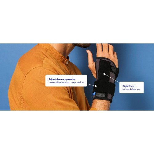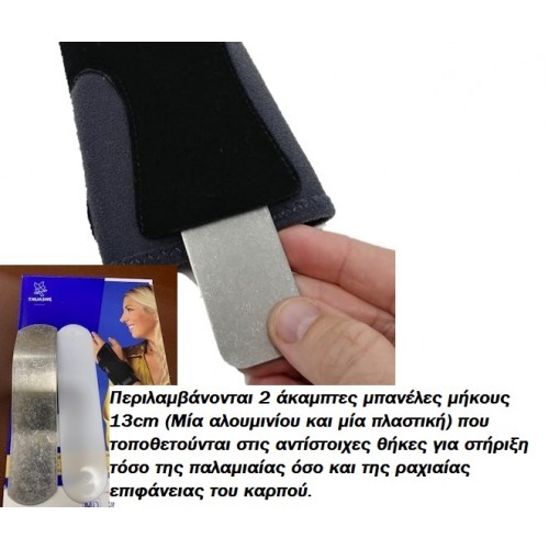 - Ακινητοποίηση: Δύο άκαμπτες μπανέλες 13cm (παλαμιαία και ραχιαία , σε υλικό αλουμίνιο και πλαστικό ) για σταθερή υποστήριξη του καρπού.